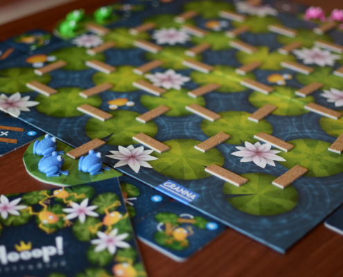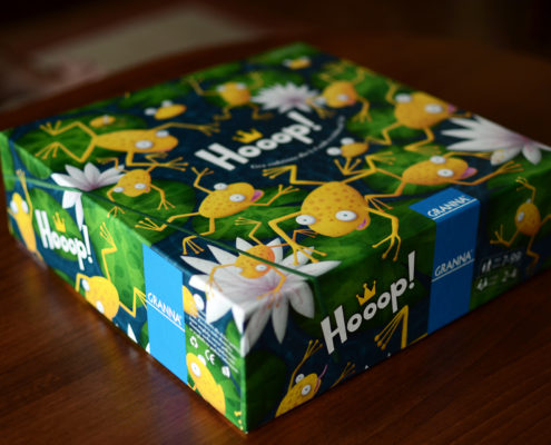 Żabki nie dość, że wyglądają milutko, to skoczny sposób ich poruszania się można łatwo wpleść w mechanikę gry. W Hooop! każdy z graczy kieruje grupką trzech z nich, wybraną spośród czterech kolorów. W zależności od liczby graczy należy je przeprowadzić w odpowiednich proporcjach na liście startowe przeciwników. Ruch odbywa się po liściach znajdujących się na bajorku (plansza), co ciekawe, owe liście połączone są ze sobą kładkami. Żabki są na tyle niezdarne, że skacząc, podtapiają kładkę i należy ją usunąć z planszy. Nasi podopieczni nie lubią także ciasnoty, toteż gdy przeskoczą na liść zajęty przez innego przedstawiciela gatunku, spychają go dalej.