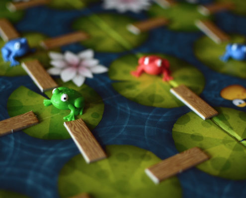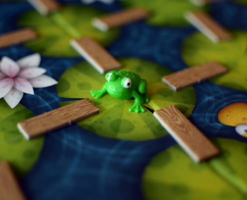 W nieco za dużym pudełku dostajemy do dyspozycji dwustronną planszę (w zależności od liczby graczy zabawa toczy się nieco inaczej), po trzy żabki w czterech kolorach, żetony startowe i specjalne dla każdego z graczy oraz 50 tekturowych kładek. Planszę, przedstawiającą bajorko, zdobią lilie wodne, których liście posłużą nam za pola gry. Przed rozgrywką należy rozmieścić pomiędzy nimi kładki.