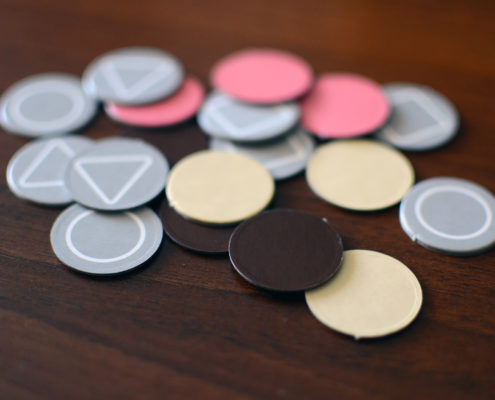 • nowa wersja: szara podstawka, kolory czekoladek: róż, brąz, biel, żetony pomocnicze