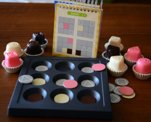 Łamigłówka nawiązuje zasadami do japońskiej gry SUDOKU. Zasady gry są bardzo proste – naszym celem jest rozmieszczenie na planszy wszystkich czekoladek zgodnie z podpowiedziami znajdującymi się na karcie zadania (pozycja czekoladki, kształt, kolor). W niektórych zadaniach dowiemy się  o kolorze i kształcie czekoladek, które należy ustawić w wyjściowym położeniu, z kolei na wyższych poziomach otrzymamy jedynie schemat z wycinkiem tacki. Resztę trzeba rozwikłać samemu. Wskazówki, jak wiadomo, nie powiedzą nam wszystkiego. Do trudniejszych zadań przydają się żetony pomocnicze, które wkładamy w domniemane miejsca czekoladek. Jest to rozwiązanie znacząco ułatwiające rozgrywkę. Wspólnie z Adamem testowaliśmy na osobach nieco starszych wersję z i bez żetonów. Ta druga, z racji potrzeby zapamiętywania wielości potencjalnych układów, sprawiała znacznie większą trudność. Naturalnie, jeśli lubimy wyzwanie i przy okazji chcemy poćwiczyć pamięć, możemy zdecydować się na nieużywanie żetonów pomocniczych.