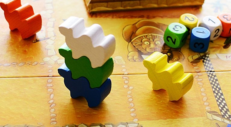 Oj czyżbym się nieco zagalopował? Ah faktycznie – nie napisałem nic o funkcji tajemniczej piramidy, która dumnie stoi na środku planszy. Ów fantastycznie wykonany gadżet czuwa nad podstawowym dla gry elementem – zarządza pulą kostek, które odpowiadają poszczególnym wielbłądom, tym samym wprowadza do zabawy niezbędną losowość. To dzięki niemu baktriany ustawiają się na linii startu oraz poruszają w trakcie gry. Każdemu zwierzakowi przypisano kostkę w odpowiadającym kolorze, na której ściankach widnieją numerki 1-3 . Za każdym razem, gdy obracamy piramidę celem losowania, wypada dokładnie jedna taka kość – określając wartość ruchu i kolor wielbłąda. Sprytne rozwiązanie, które zwykłemu rzutowi nadaje sympatyczną otoczkę i zabawny ceremoniał.