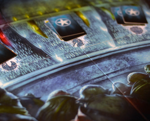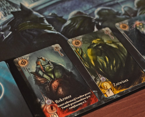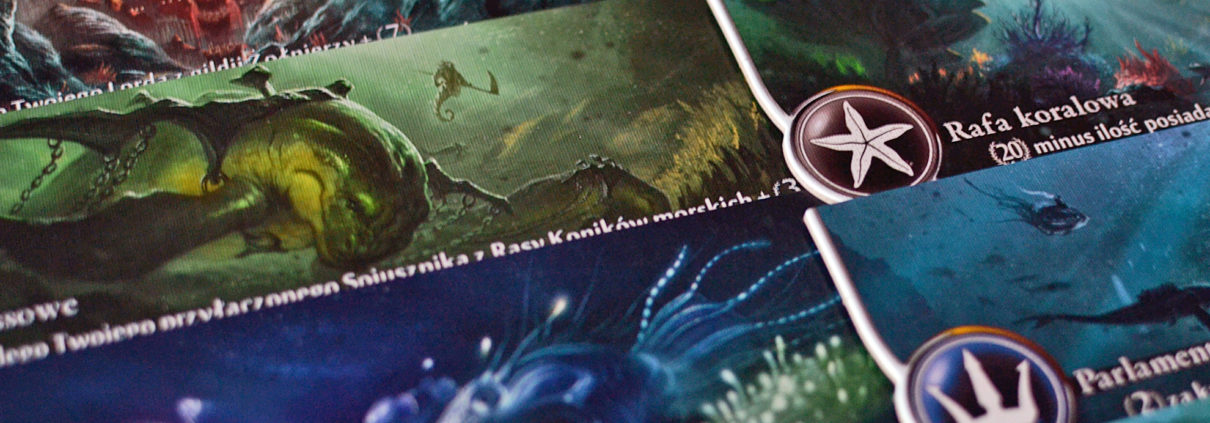Chociaż oprawa tylko umownie wiąże się z tematem, trudno nie poświecić jej przynajmniej chwili. W końcu to przede wszystkim ona przyciągnęła moja uwagę do tego tytułu. Ilustracje i grafiki są jak sami widzicie fantastyczne – żywe, szczegółowe, a przy tym niepowtarzalne dla każdej karty lorda i płytki miejsca. Abyss to zdecydowanie jedna z tych gier euro, które swoim przykładem zaprzeczają opinii, jakoby te z definicji musiały ustępować pola tytułom w stylu amerykańskim.