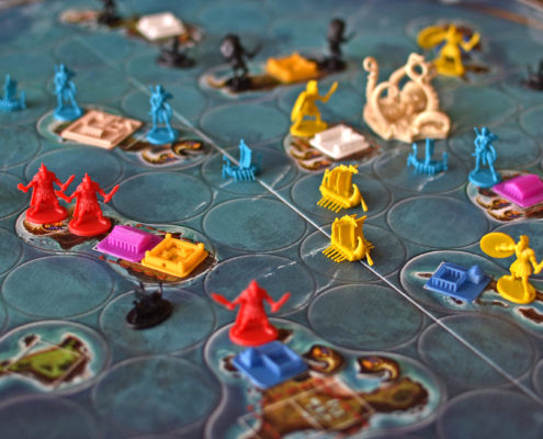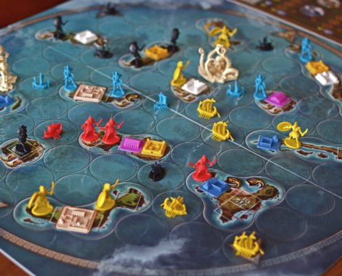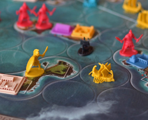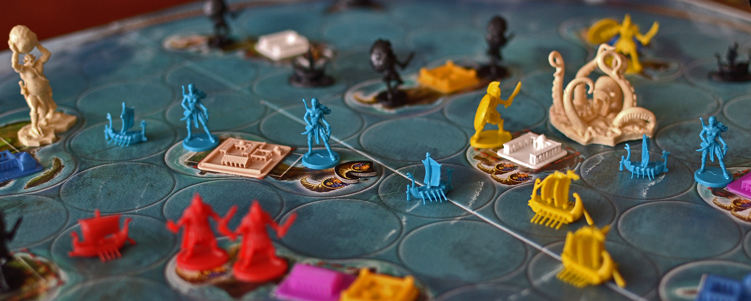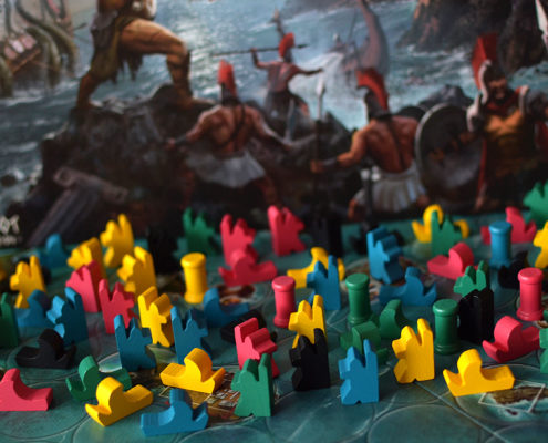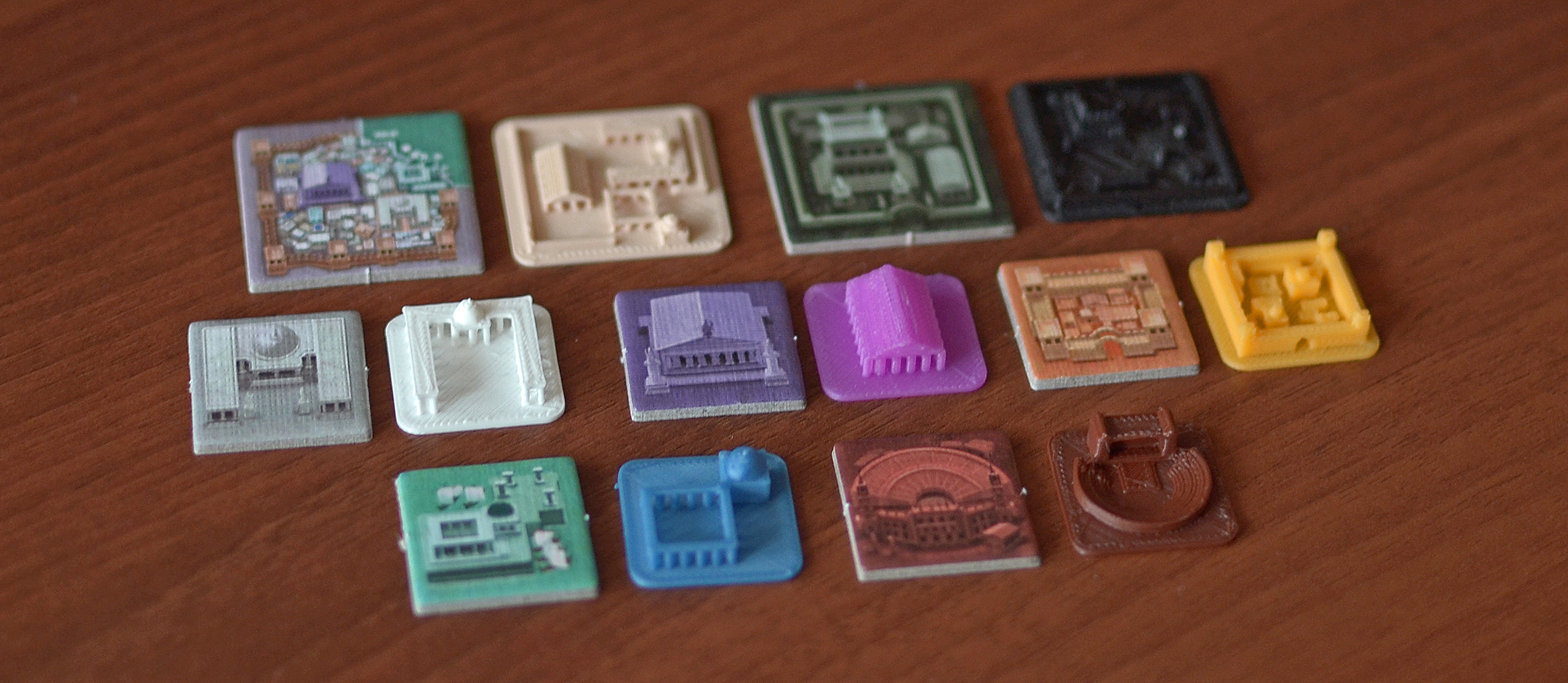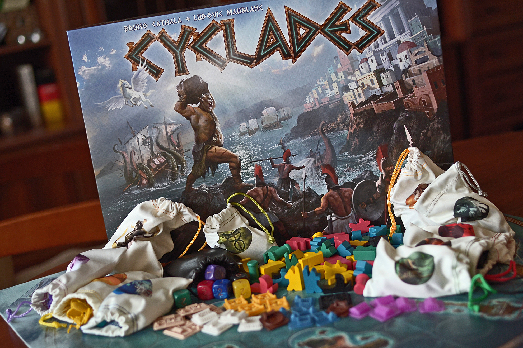 Pomysł na wpis pojawił się zupełnie niespodziewanie. Najpierw wydawnictwo Matagot skontaktowało się z nami, by + w wyrazie uznania za udostępnione na BGG zdjęcia swoich gier – przesłać nam drobny upominek. Niedługo później otrzymaliśmy równie sympatycznego maila do sklepu CleverSteps (update: sklep został zamknięty), zajmującego się projektowaniem i wydrukiem 3D, pionów oraz wszelkiej maści ulepszeń gier planszowych. Przesłane drobiazgi spodobały się nam tak bardzo, że postanowiliśmy – w formie tej niewielkiej galerii – podzielić się z Wami efektem ulepszenia serii Cyklady, gdyż to własnie do niej otrzymaliśmy rzeczoną garść ornamentów.