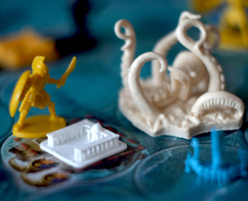 Zaczynamy od oferty CleverSteps, czyli w naszym przypadku, wydrukowanych w technologii FDM, plastikowych replik budynków do podstawowej wersji Cyklad oraz dodatku Hades. Te idealnie wpisują się w estetykę gry, gdyż podobnie jak figurki graczy, są wykonane z kolorowego plastiku.