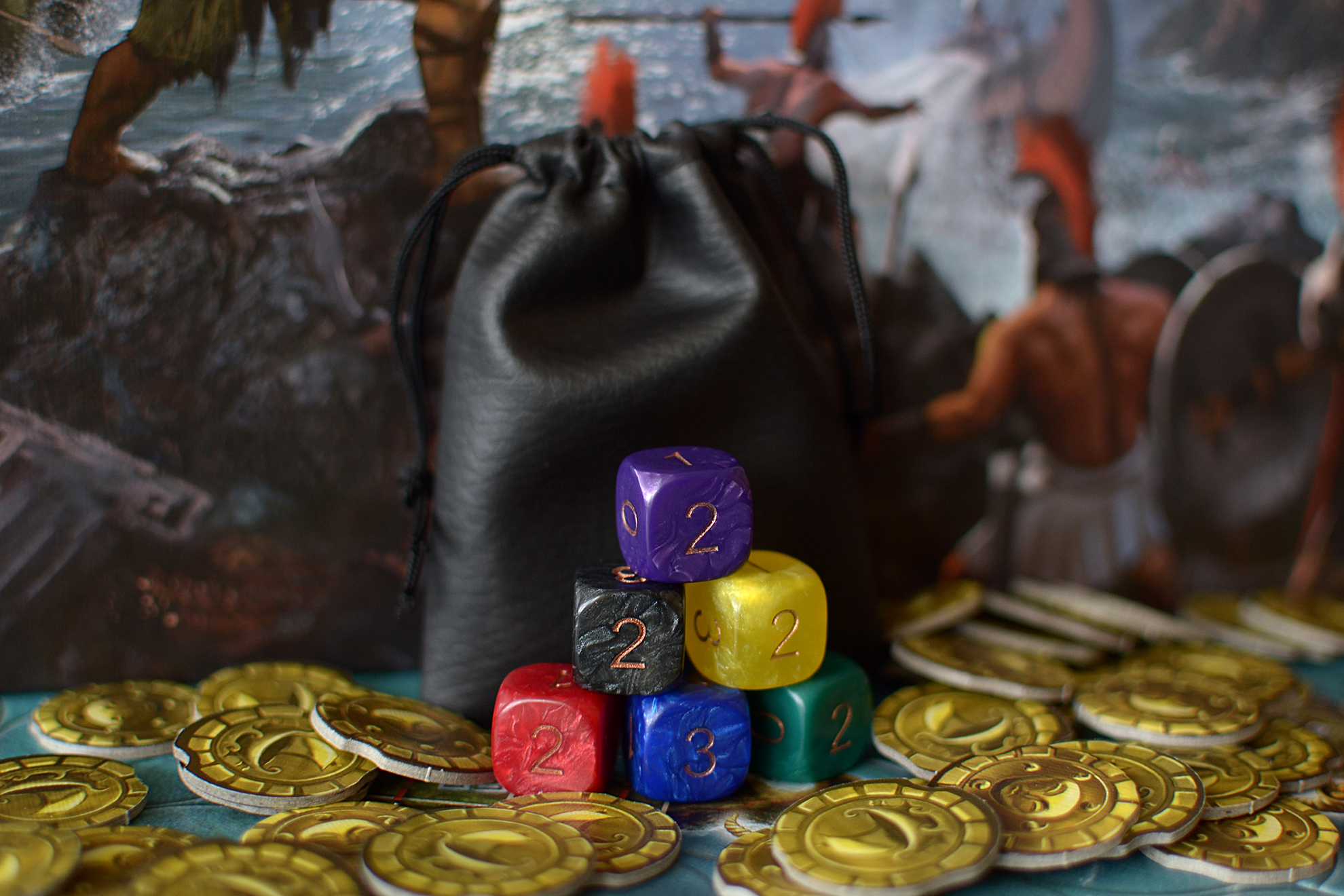 Czas na drugiego dobrodzieja. Od francuskiego wydawnictwa otrzymaliśmy komplet pięknie wykonanych, płóciennych woreczków na elementy, kolorowe kości bitewne w kolorach graczy oraz komplet drewnianych żołnierzy i statków – coś w sam raz dla tych wszystkich, którzy wolą europejską szkołę wykonywania gier.